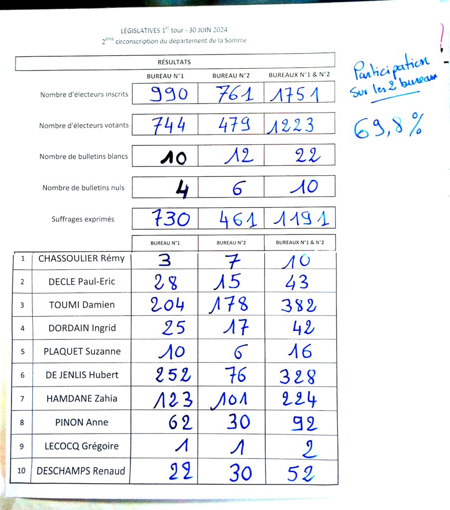 11 juillet 2024En cette période estivale, l’indisponibilité de la salle des fêtes nous oblige à transférer les 2 bureaux de vote pour les scrutins du 30 juin et du 7 juillet de 8h à 18h, au Groupe Scolaire situé, 4 chemin de Saveuse.