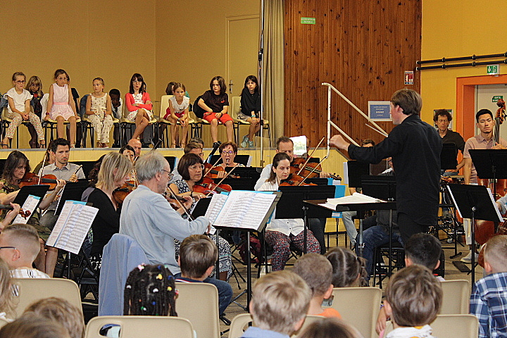 Le chef d’orchestre Antoine DUTAILLIS a su captiver les enfants présents. En leur présentant chaque instrument de l’orchestre, il leur a expliqué entre autres que la différence de taille des instruments jouait sur leur sonorité, prenant des exemples précis, violon, violoncelle….